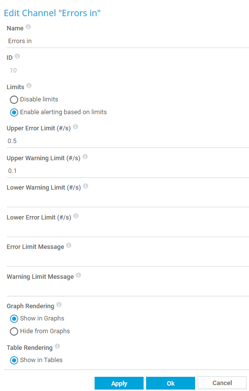 Define if you want to set limits for this channel. The channel can affect the status of the sensor that it is a part of. By setting limits, you can define when the sensor shows the Warning state or the Down state, depending on the channel data. For example, you can use limits to set a traffic sensor (that is usually never in the Down state) to show the Down state when the monitored values reach critical limits.