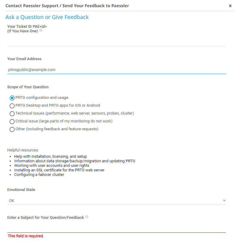 For technical issues, use the Contact Paessler Support / Send Your Feedback to Paessler form in PRTG. To open the form, select Setup | Contact Support from the main menu bar. You can also open the form via Contact Support in the footer on every page in the PRTG web interface.