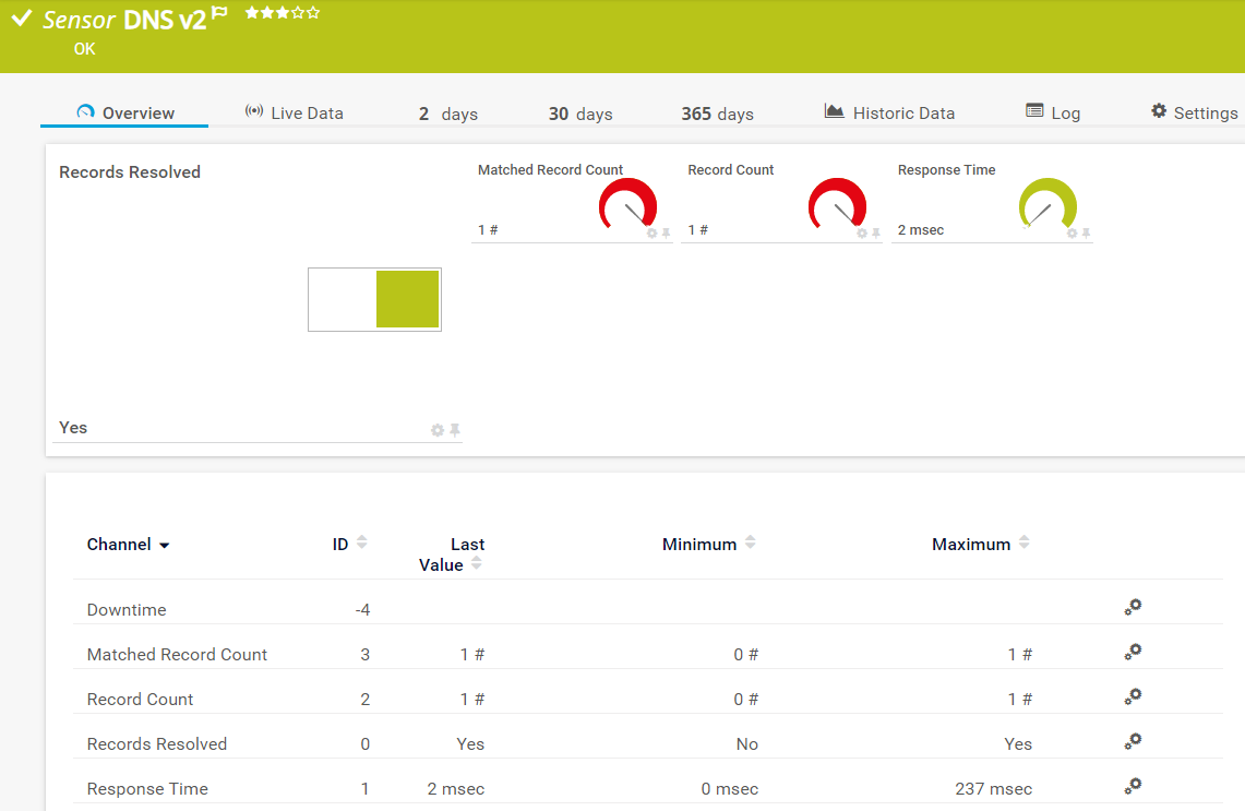 In the channel table on the Overview tab, this channel never shows any values. PRTG uses this channel in graphs and reports to show the amount of time in which the sensor was in the Down state