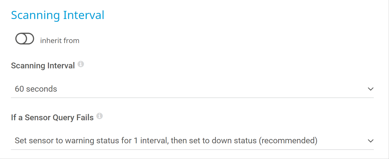 Select the number of scanning intervals that the sensor has time to reach and to check a device again if a sensor query fails. Depending on the option that you select, the sensor can try to reach and to check a device again several times before the sensor shows the Downstatus. This can avoid false alarms if the target device only has temporary issues. For previous scanning intervals with failed requests, the sensor shows the Warning status.