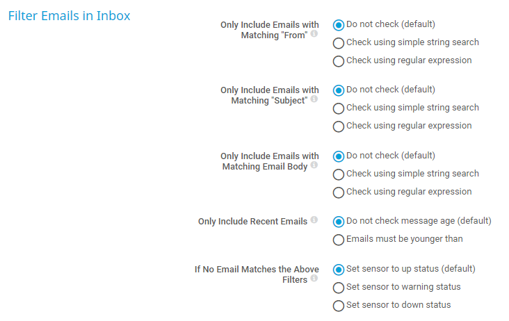 <%C_Set_sensor_to_down_status%>: Show the Down status if the sensor does not find any email in the mailbox that matches the filters.