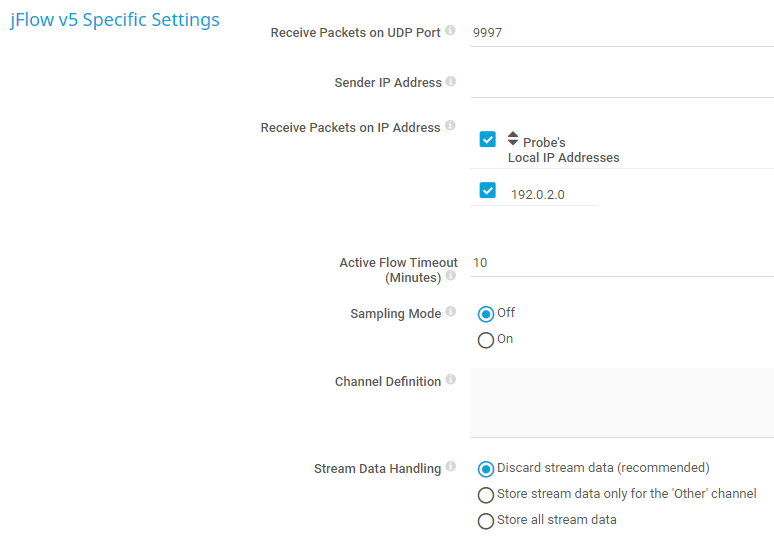This sensor requires that the jFlow export of the respective version is enabled on the target system. The target system must send the flow data stream to the IP address of the probe system.
