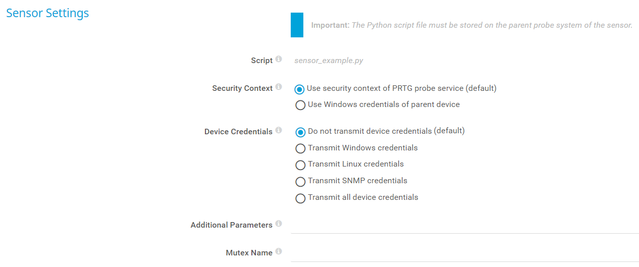 Define if you want to transmit device credentials to the Python script. PRTG adds the device credentials to the JSON object that is passed to the script as a command-line parameter.