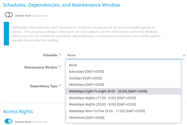 With schedules, you can specify active and inactive time spans for monitoring. For example, you can choose to monitor only on Sundays between 16:00 and 20:00. If you use scheduling, PRTG automatically pauses specific objects outside of the scheduled active times. A sensor in the Paused state does not collect monitoring data, does not change its status, and does not trigger any notifications. You can also pause monitoring for planned system maintenance windows to avoid false alarms. You can apply different schedules to every object. PRTG also uses schedules for reports and notifications.