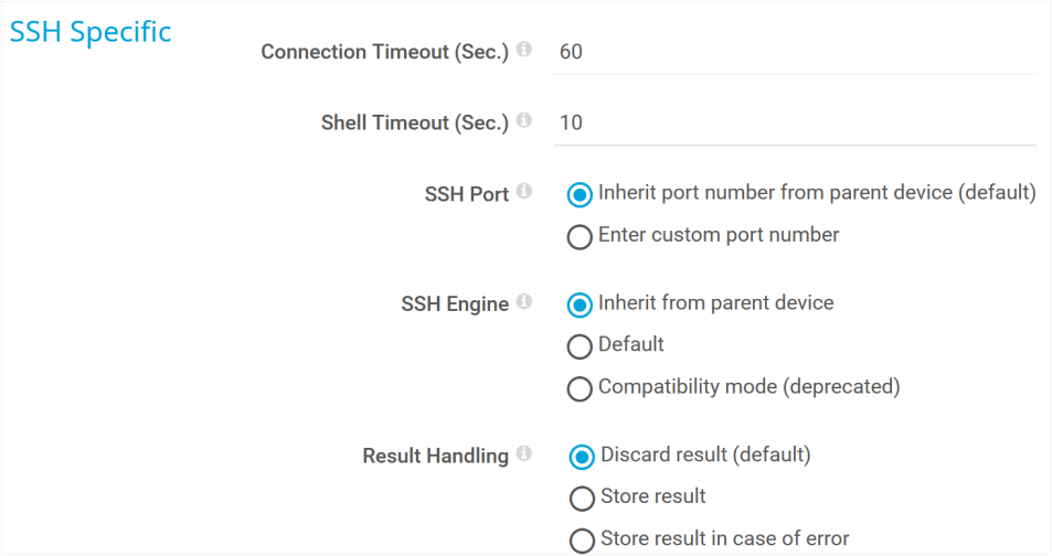 Inherit from parent device (default): Use the SSH engine that you defined in the parent device settings or higher up in the object hierarchy. If you have not changed the SSH engine, this is the recommended option.