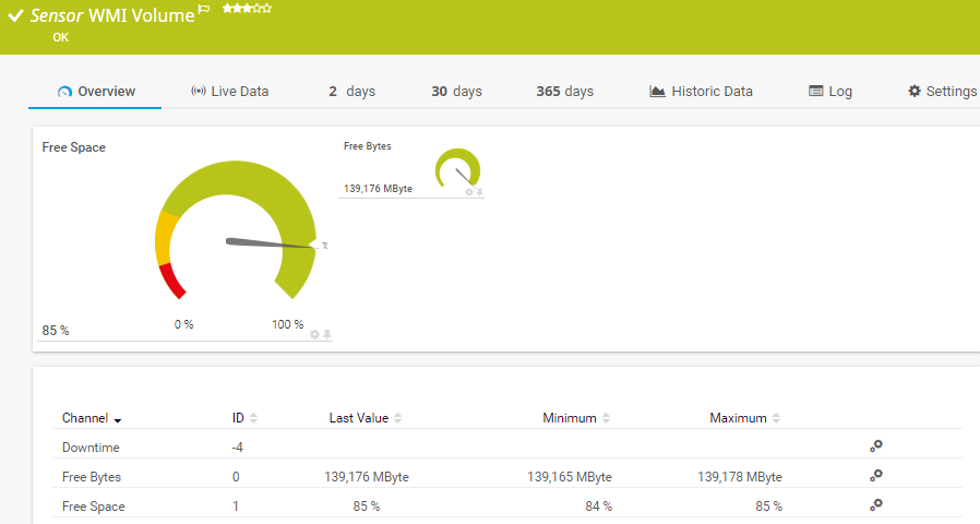 The WMI Volume sensor monitors the free disk space on a drive, logical volume, or mount point via Windows Management Instrumentation (WMI).